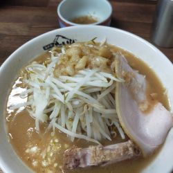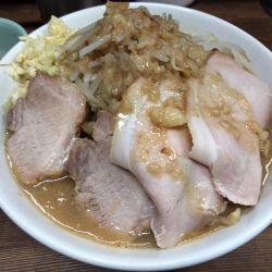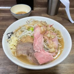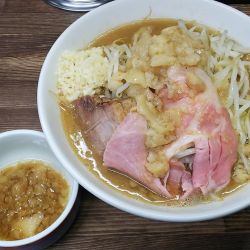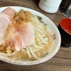 すぐに食券の回収に来たので麺の量は「中(250g)」、トッピングは「ニンニクアブラ」と伝える。